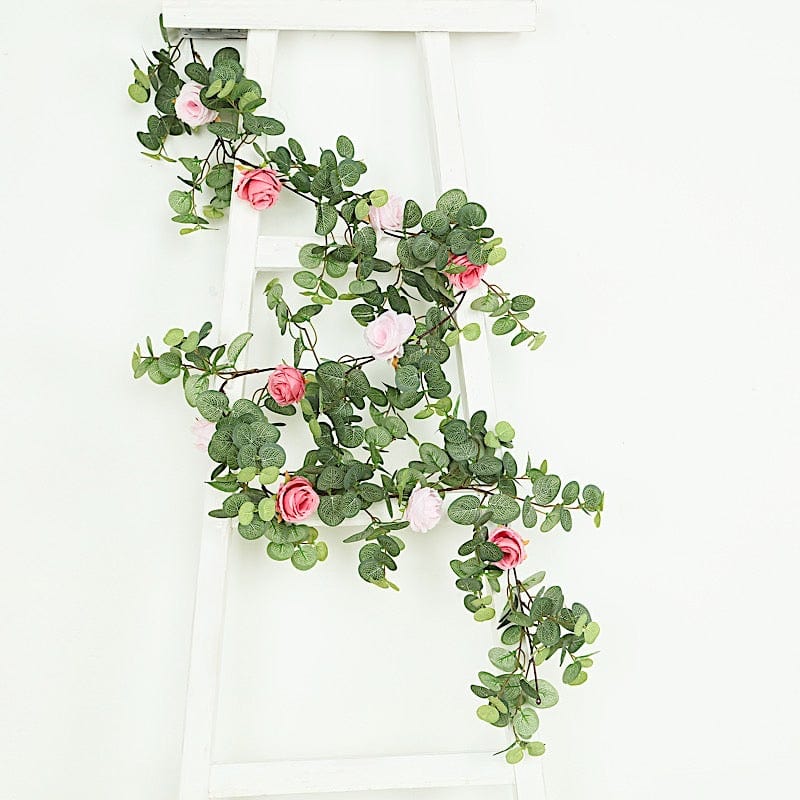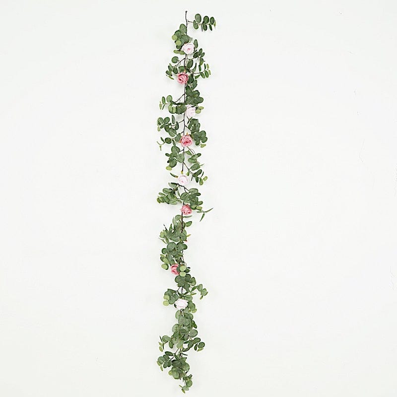 / 6 ft long Frosted Green Artificial Eucalyptus Leaves with Roses Flowers Vine Garland