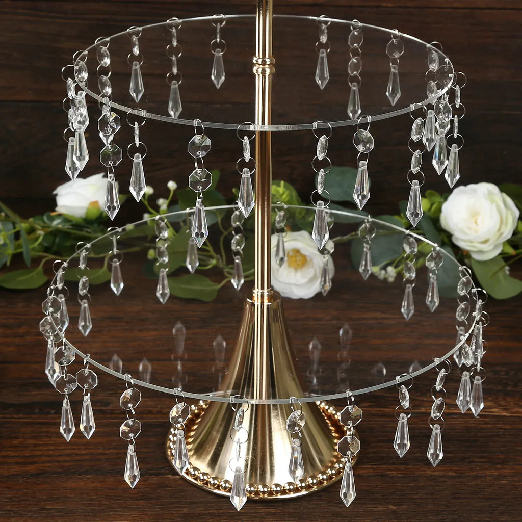 Celebrate your day with something that is both decorative and functional! This plastic cake pedestal will make a stylish dessert display for your weddings, birthdays, parties or any special gatherings. Round plates with dazzling crystal pendants can be filled with cakes, cupcakes, muffins or any sweet treats. Perfect for elevating the look of your dessert tables. The wide,  round, sturdy base can showcase your party cake and provide stability at the same time. Pair with candle displays and flower arrangements for an outstanding dessert table decoration. Great for birthdays, weddings, parties or any special gatherings.