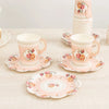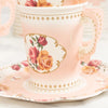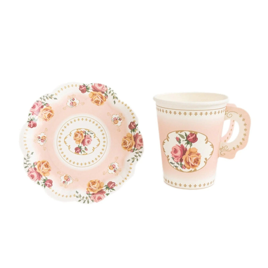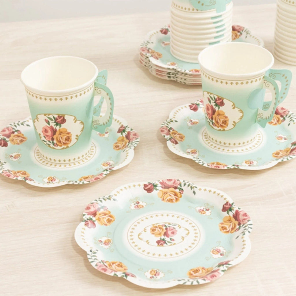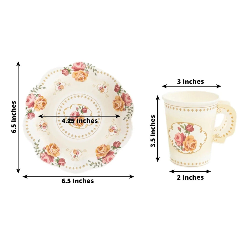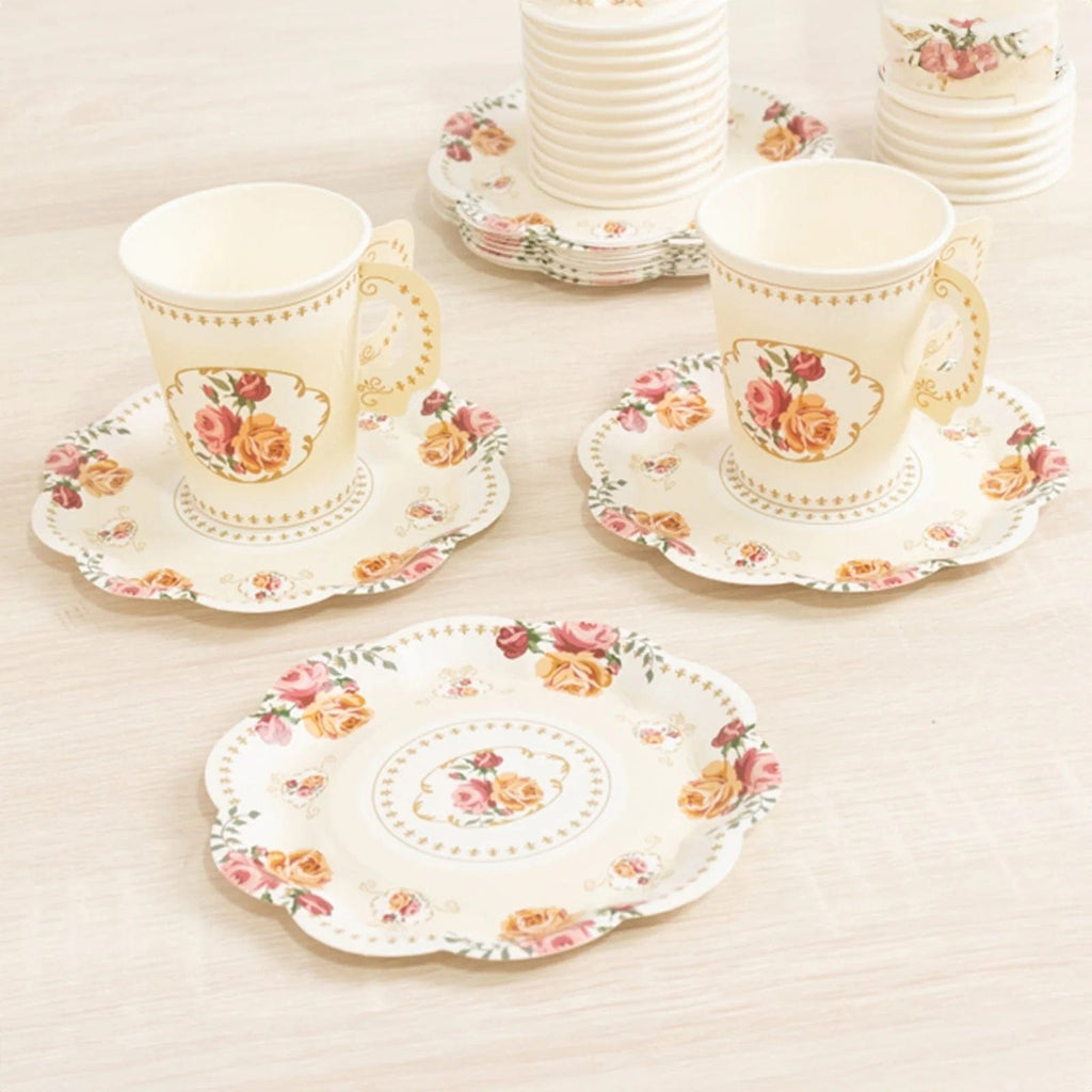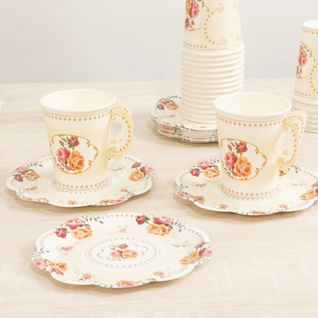 / 25 Disposable Paper Drinking Cups and Saucers with Rose Floral Design