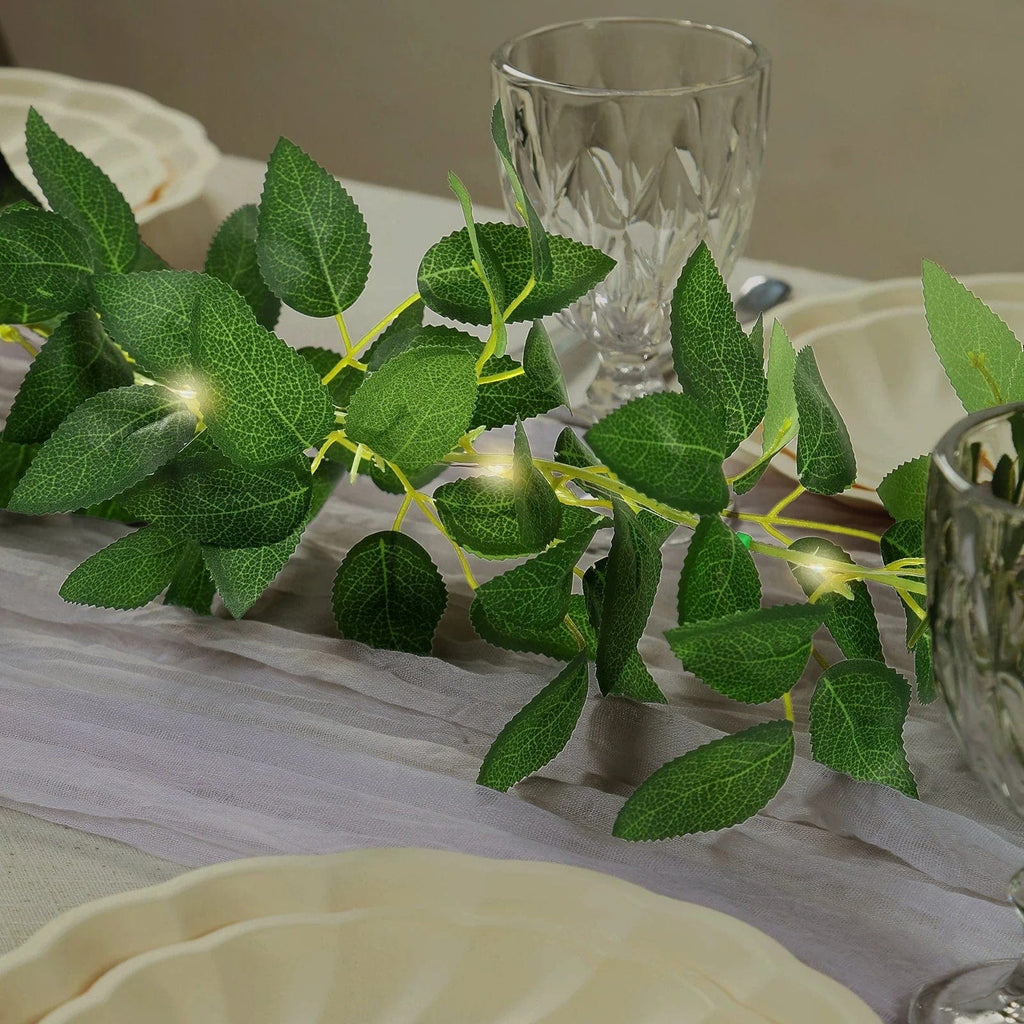 Provide romantic lighting to any decorations with this LED greenery garland! Featuring a combination of realistic and refreshing silk leaves with bright fairy string lights, this LED garland will create a dazzling look for your wedding reception, parties, events or any special occasion. This battery-operated garland can be used as backdrops or as an accent to your table centerpieces, pillars, arches, poles, banisters or floral decor to create a fairytale effect. These LED lights are battery-operated with batteries that are NOT included.