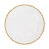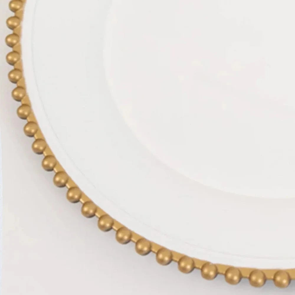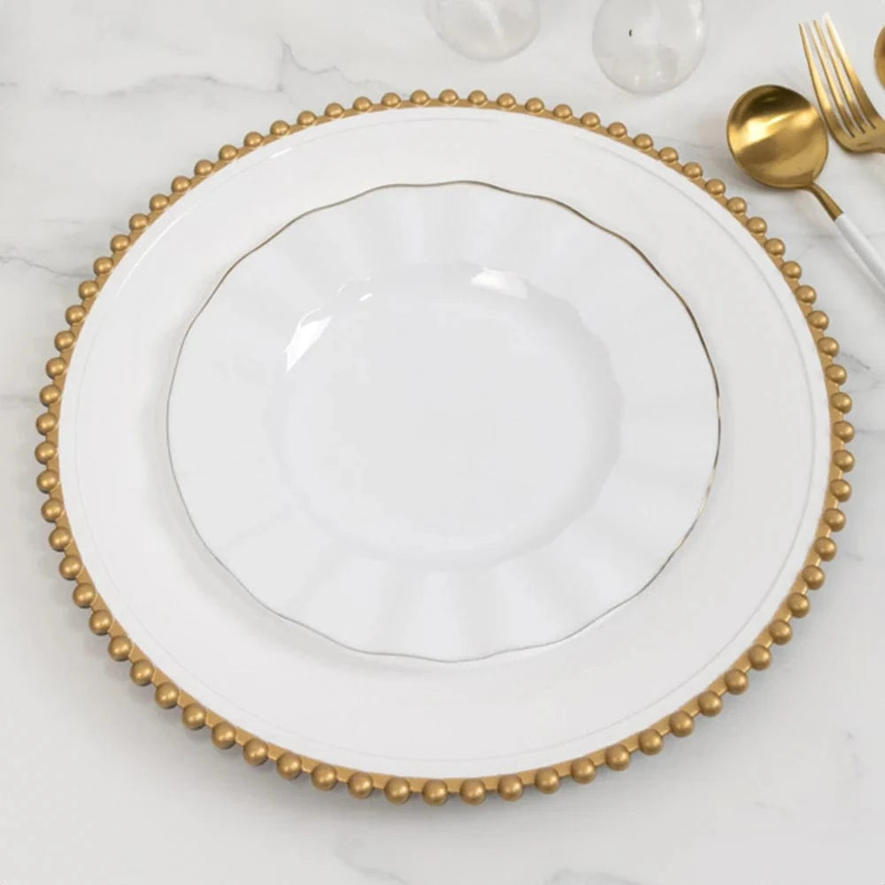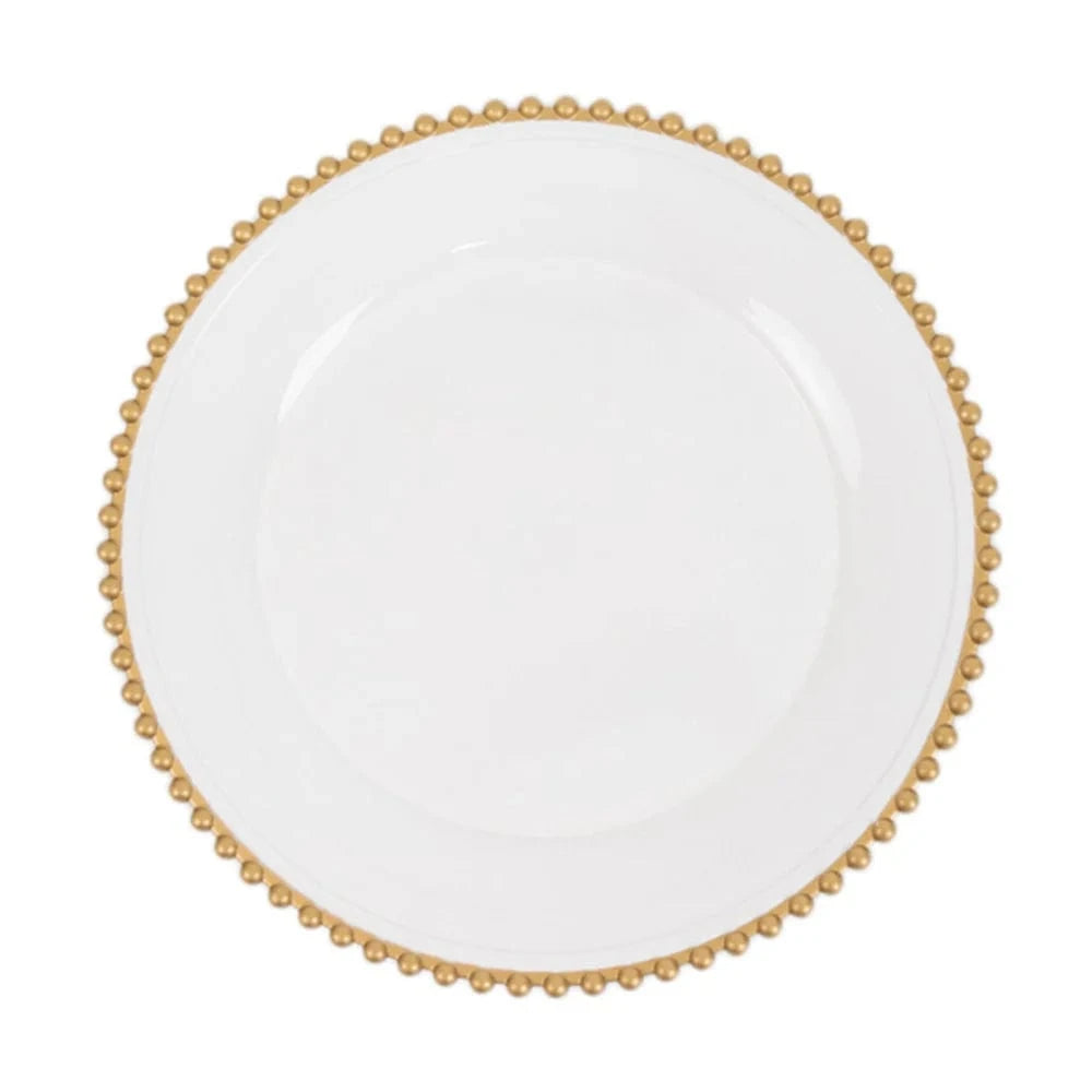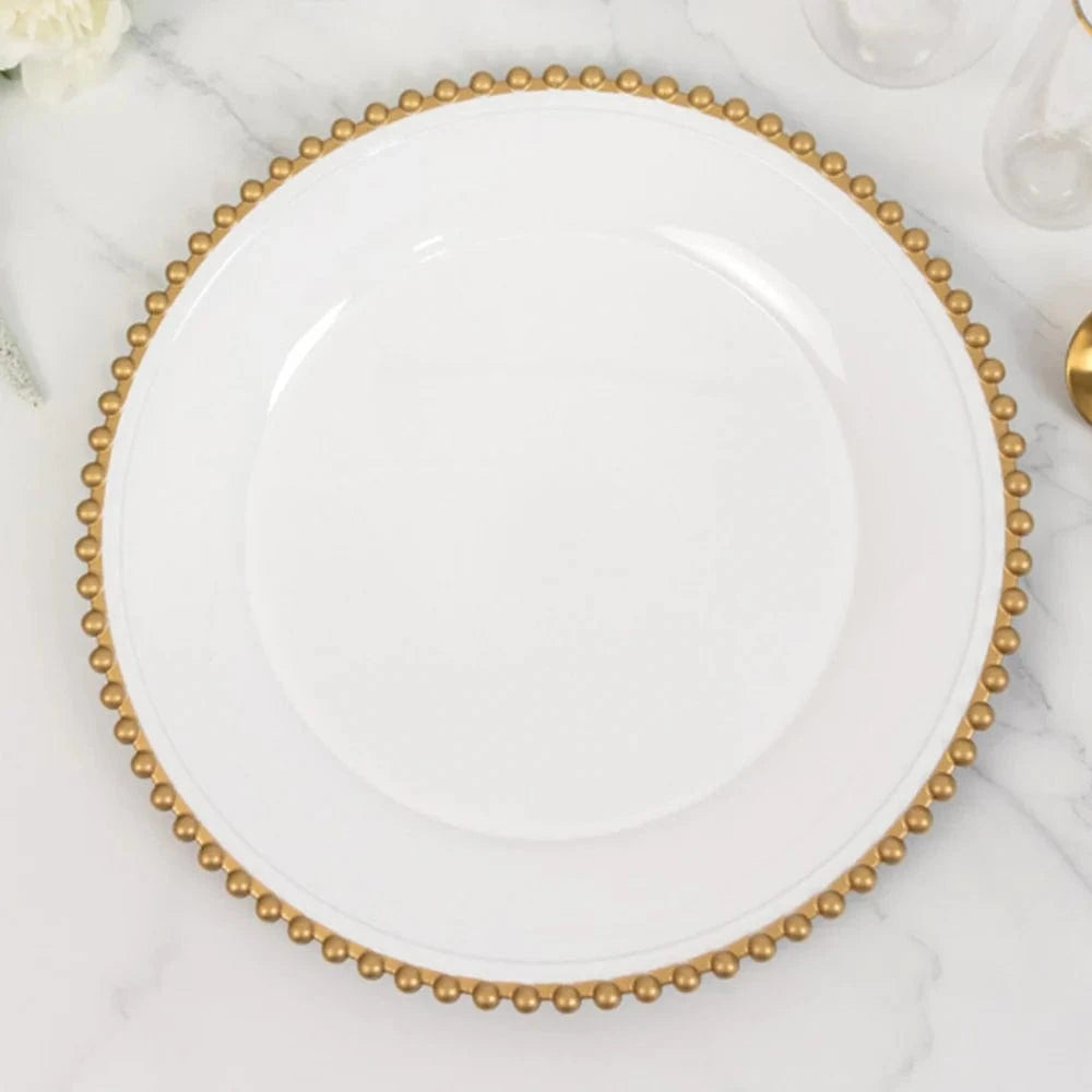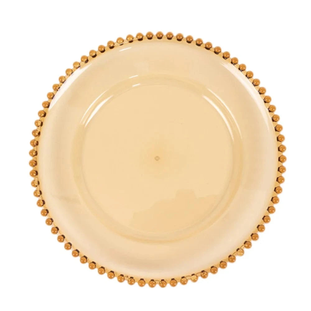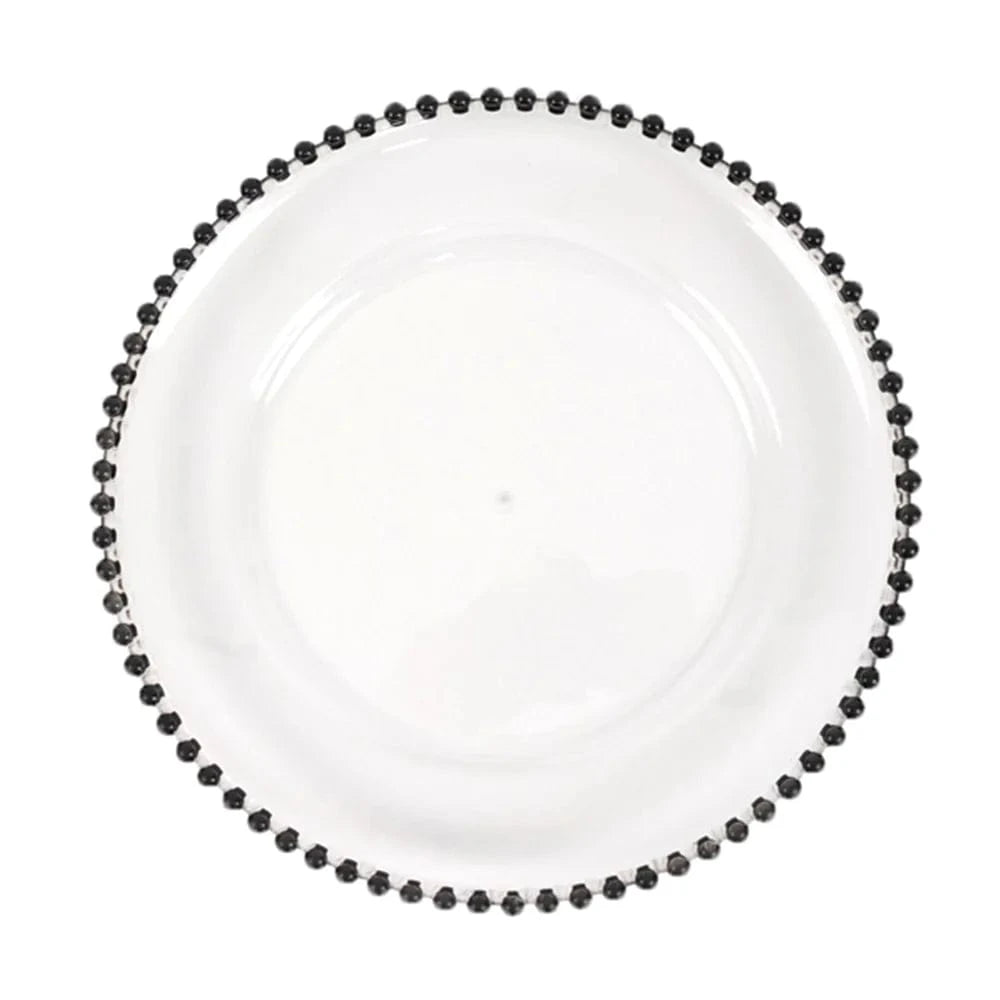 Add an elegant flair and a chic style to your table setting with these round acrylic charger plates! These chargers with beaded trim design are perfect for your bridal showers, beach side celebrations and outdoor reception, graduation, birthday parties and more. They are easy to clean, just wash with hot water.